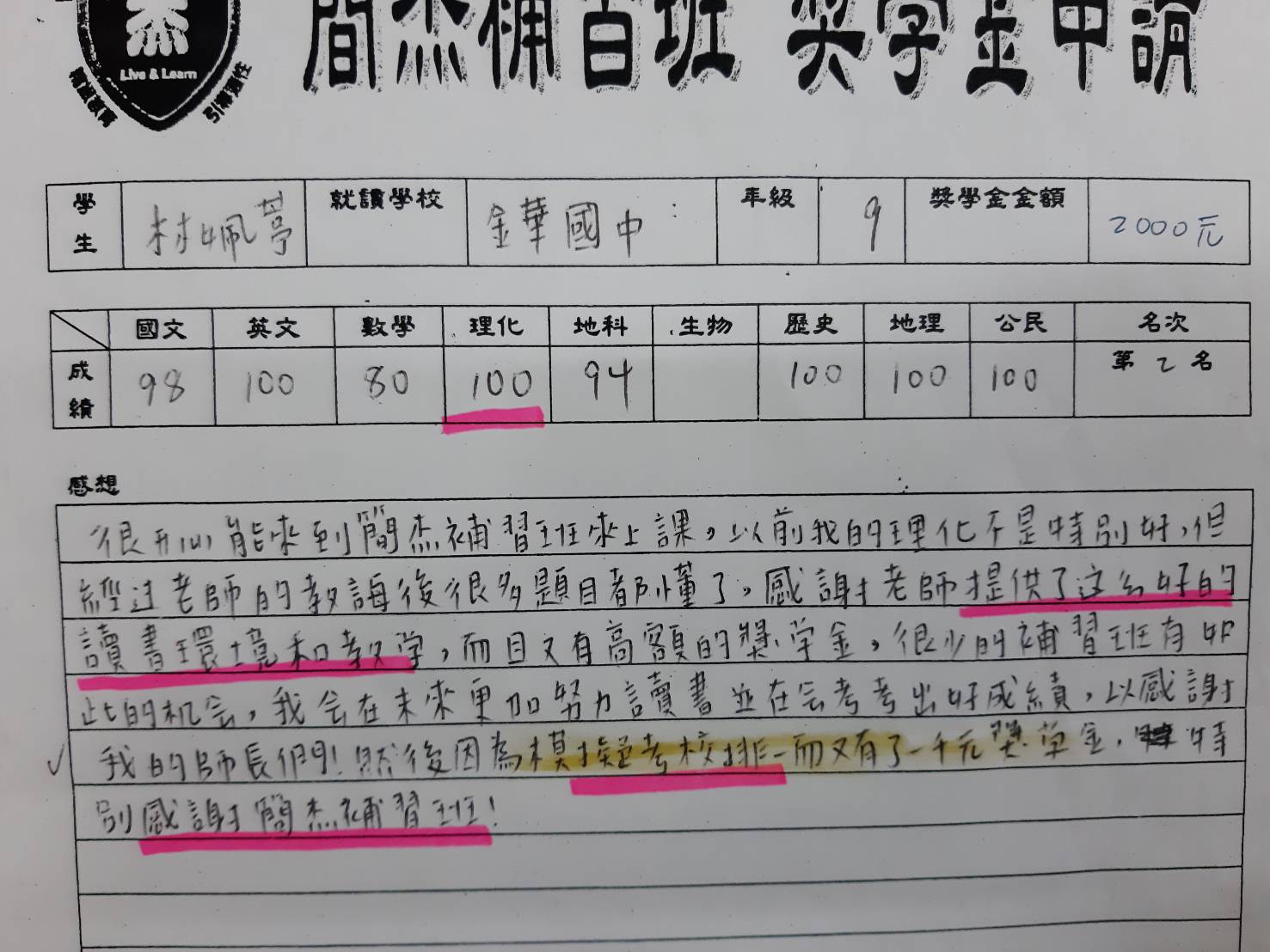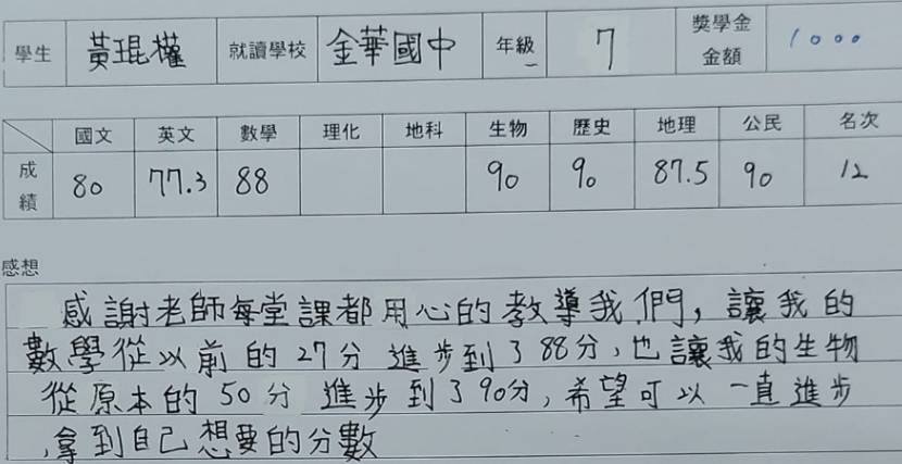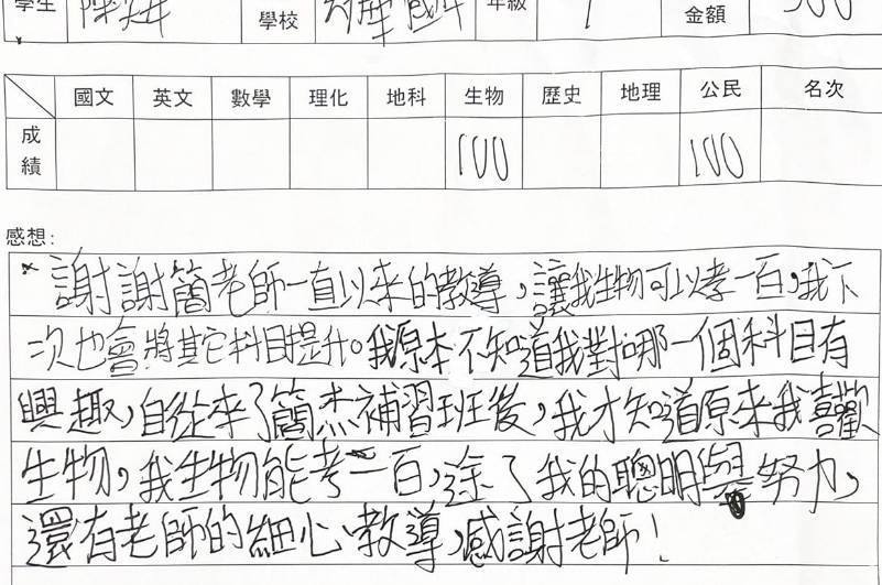 「老師懂孩子,也懂得讓孩子愛上寫作,成績是自然結果。」